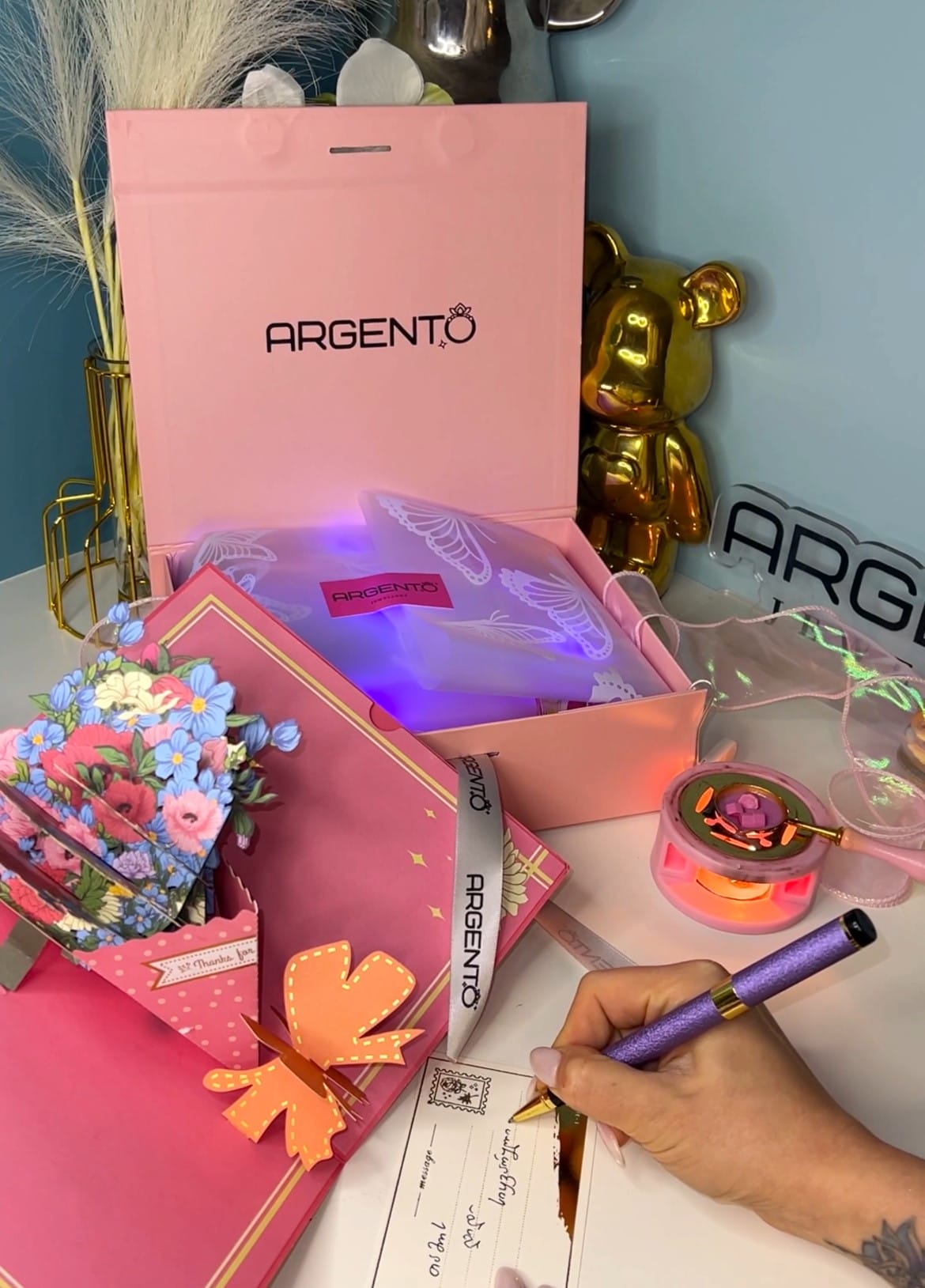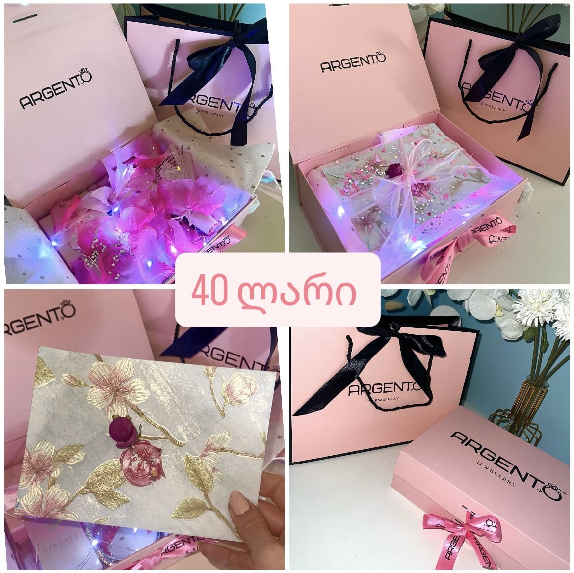ბრენდირებული ყუთი მაგნიტზე+სამკაული ყუთი+ხელოვნური ვარდის ფურცლები+ განათება +  წერილი სასურველი ტექსით  + გაფორმება + ბრენდირებული მუყაოს ჩანთა - 40 ლარი
