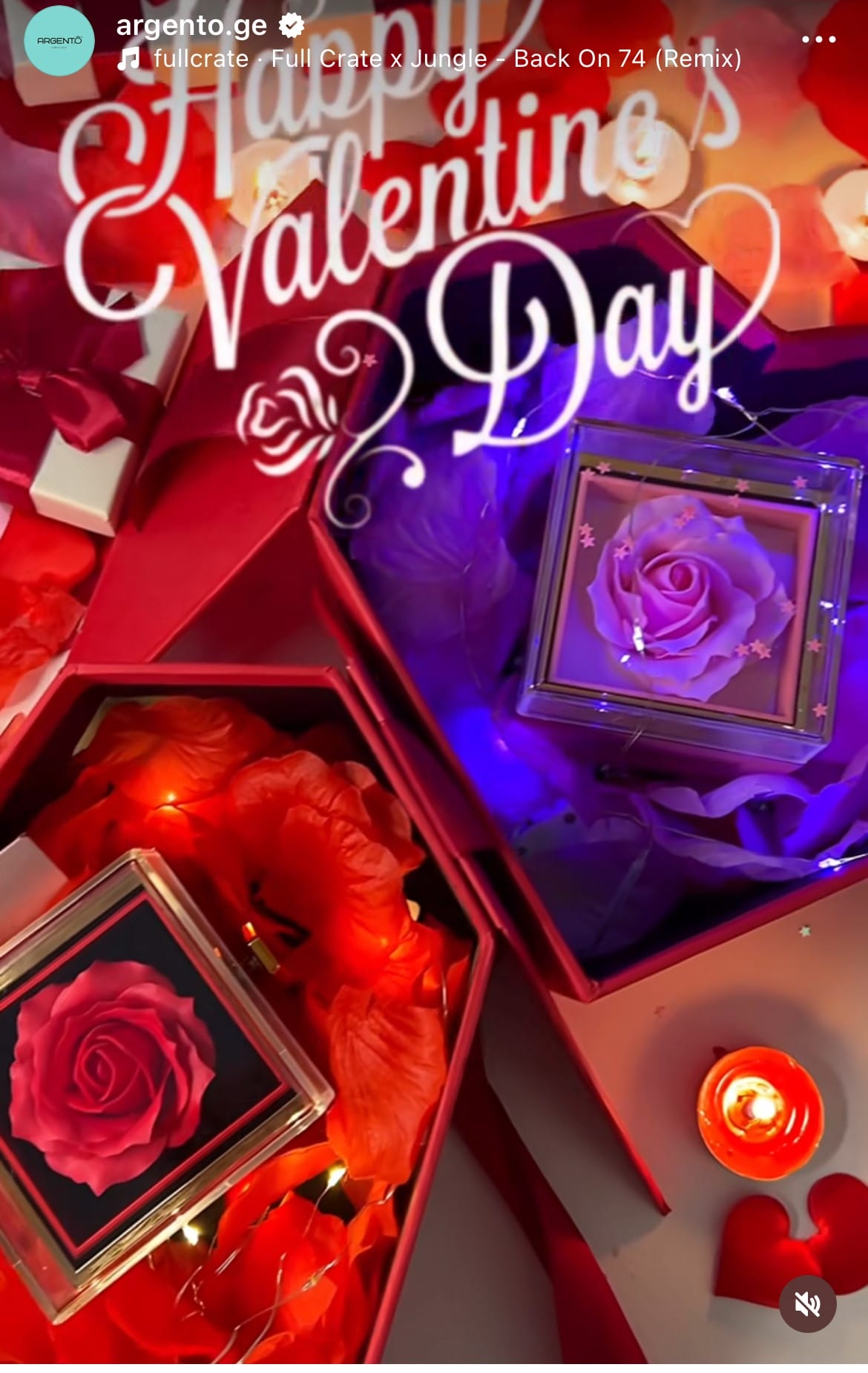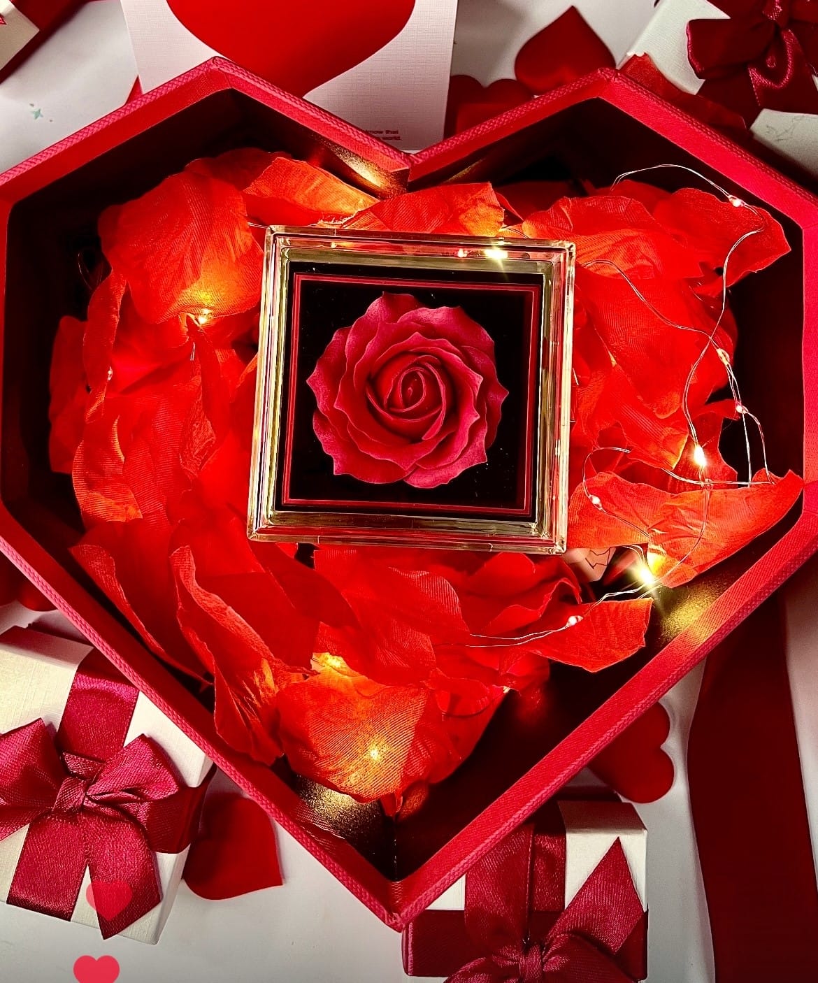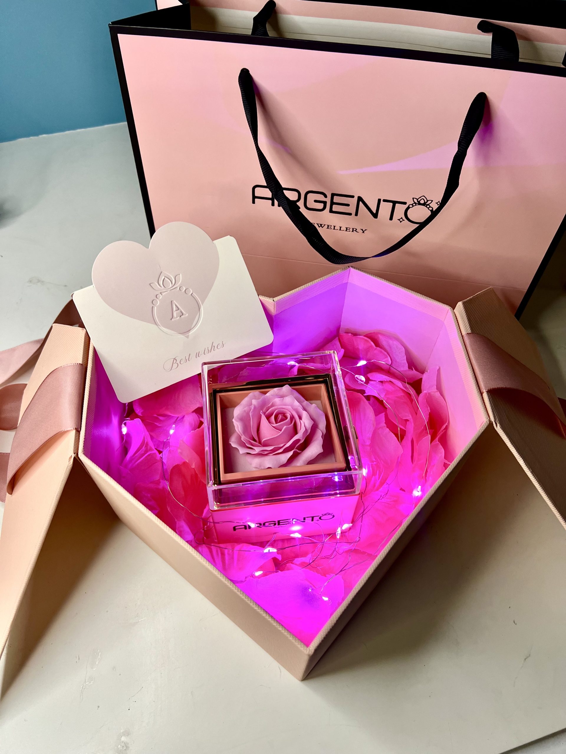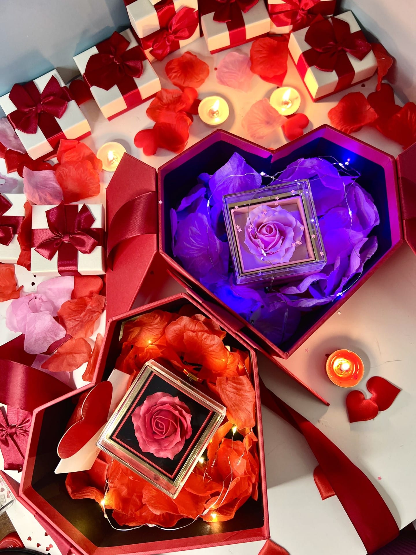 გულის ფორმის ყუთი ვარდის ყუთი მისალოცი ბარათი სასურველი ტექსტით განათება ბრენდირებული მუყაოს ჩანთა