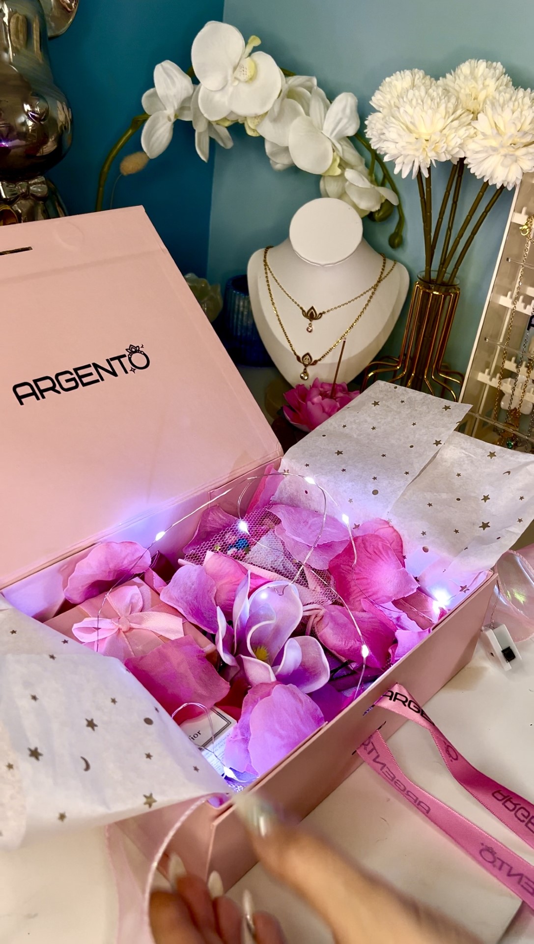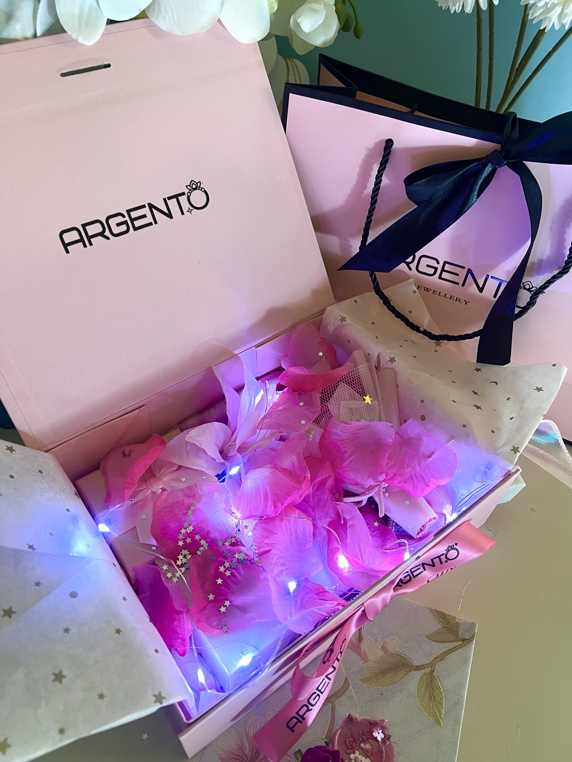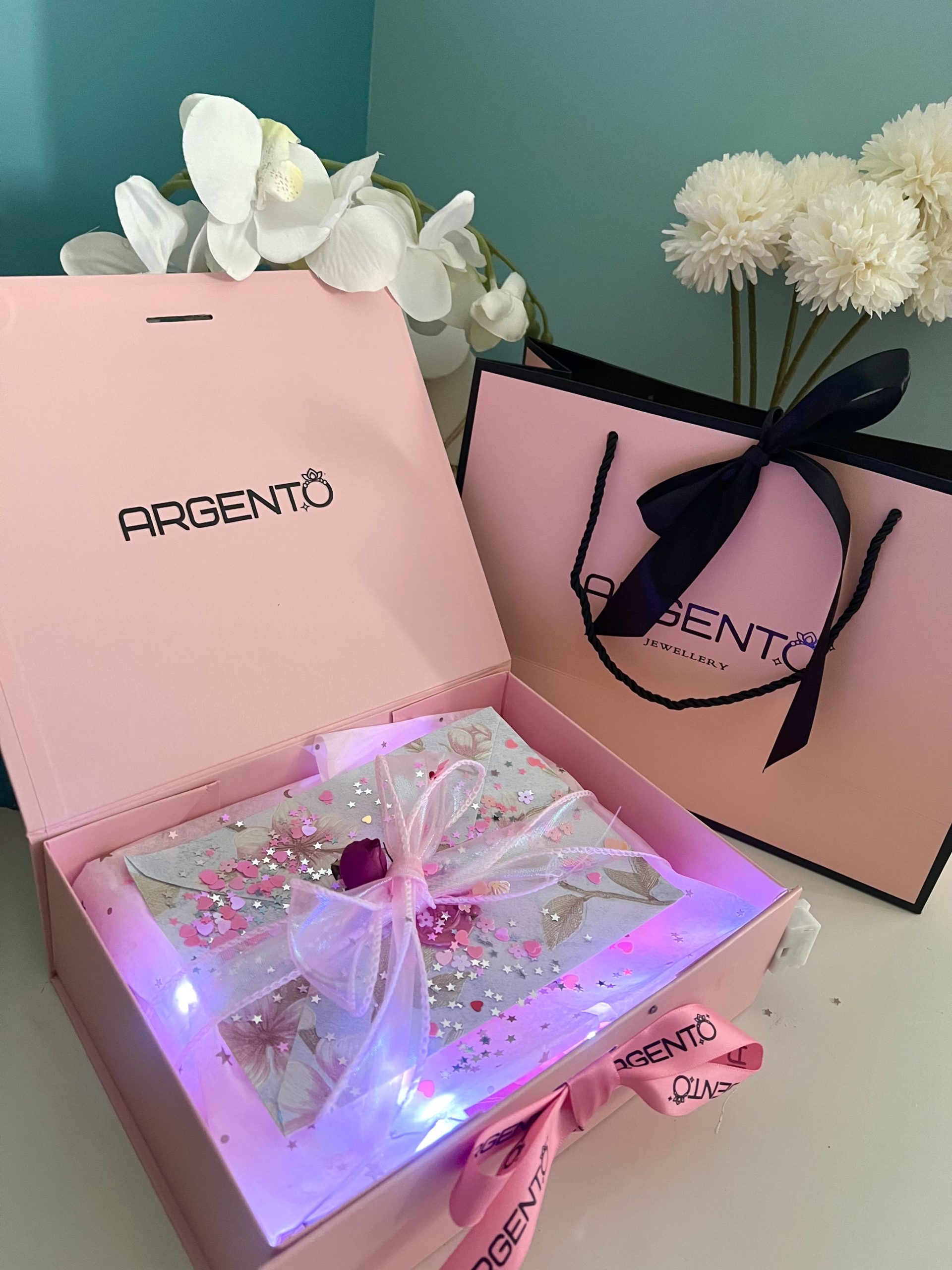 ბრენდირებული მუყაოს ყუთი მაგნიტზე სამკაულის ყუთი ხელოვნური ვარდის ფურცლები განათება წერილი სასურველი ტექსით ლამაზი გაფორმება ბრენდირებული მუყაოს ჩანთა ლენტით