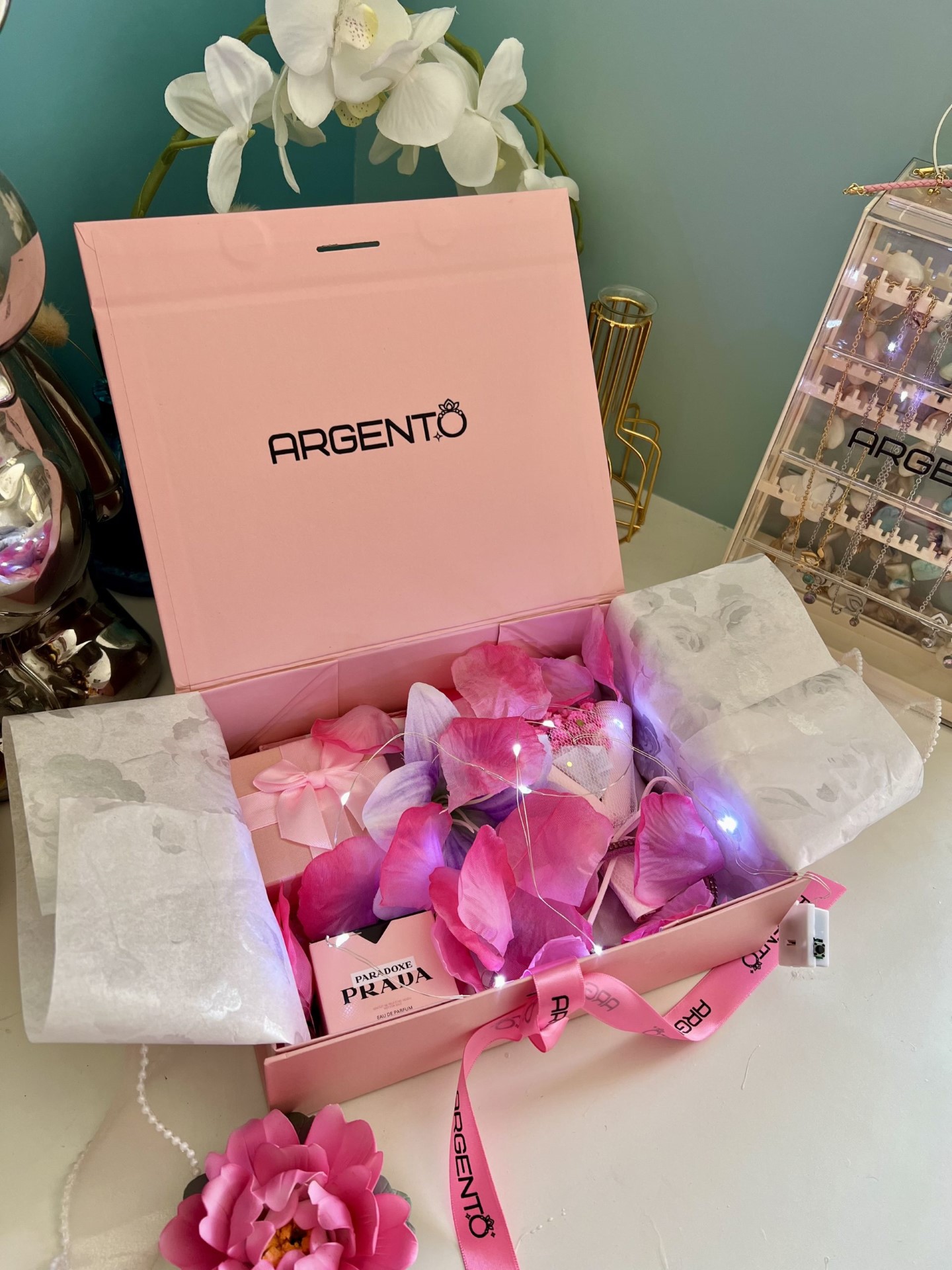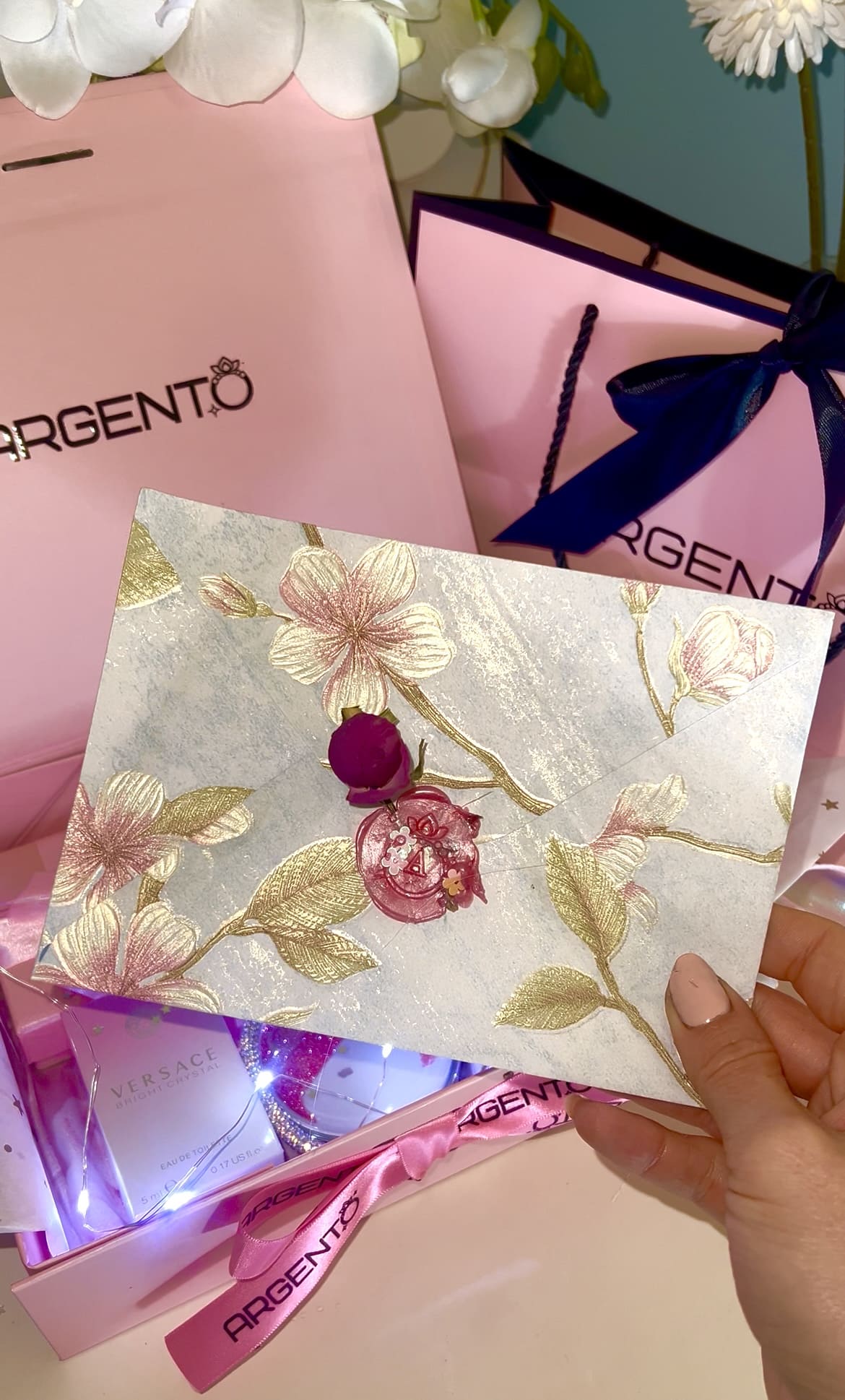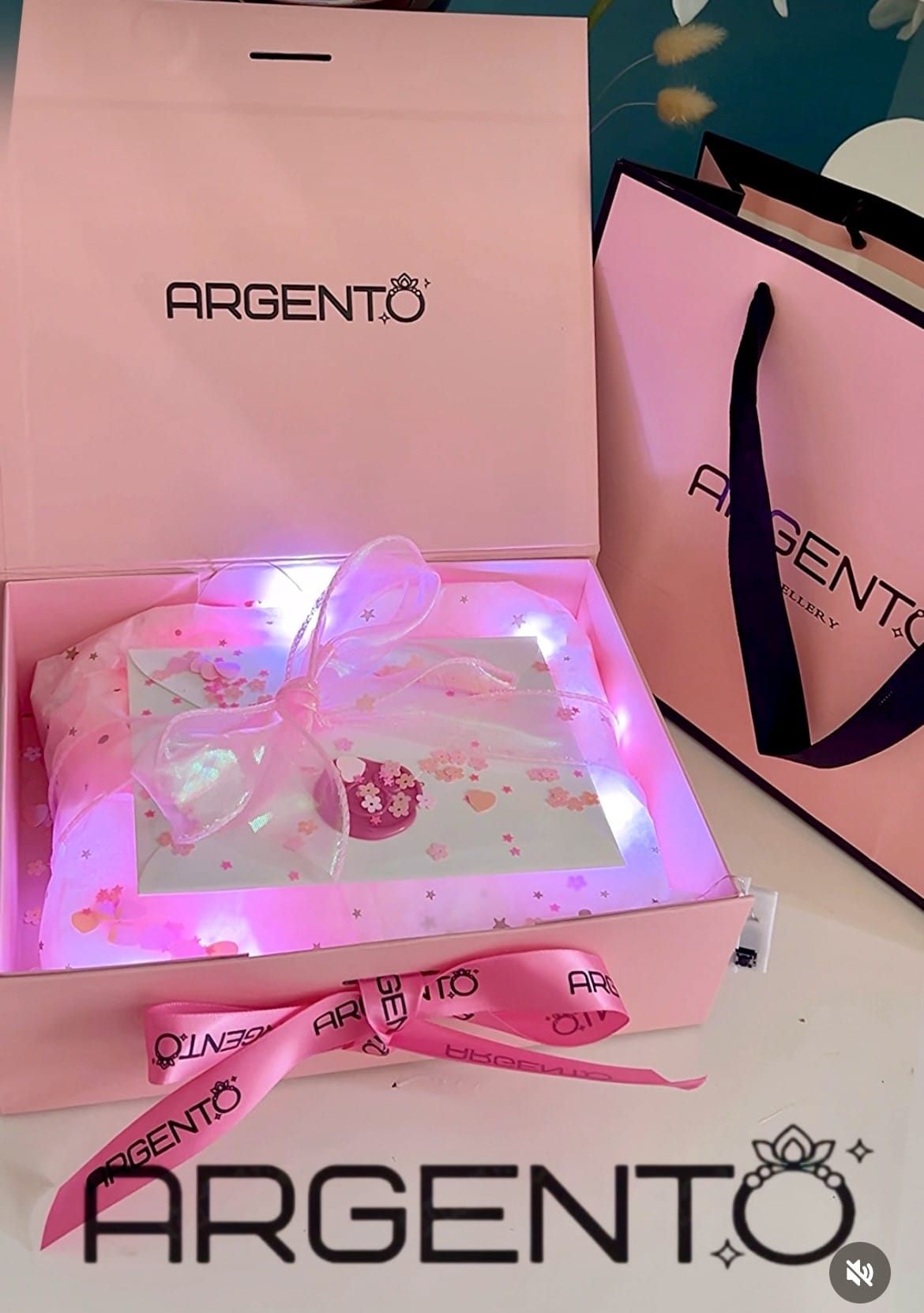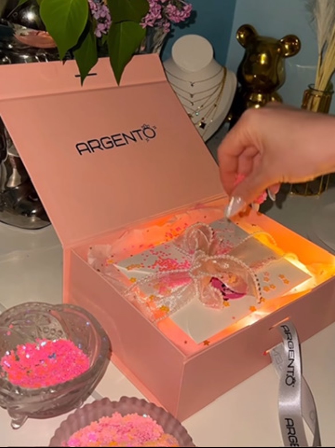 ბრენდირებული მუყაოს ყუთი მაგნიტზე სამკაულის ყუთი ხელოვნური ვარდის ფურცლები განათება წერილი სასურველი ტექსით ლამაზი გაფორმება ბრენდირებული მუყაოს ჩანთა ლენტით